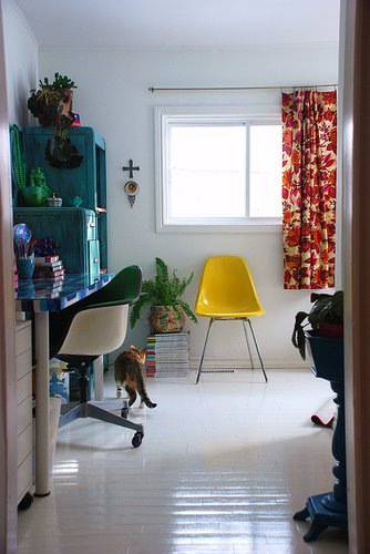 I love the white walls and floor as a backdrop for the pops of bright colors. Totally different than what I’m doing with my room, but awesome nonetheless.